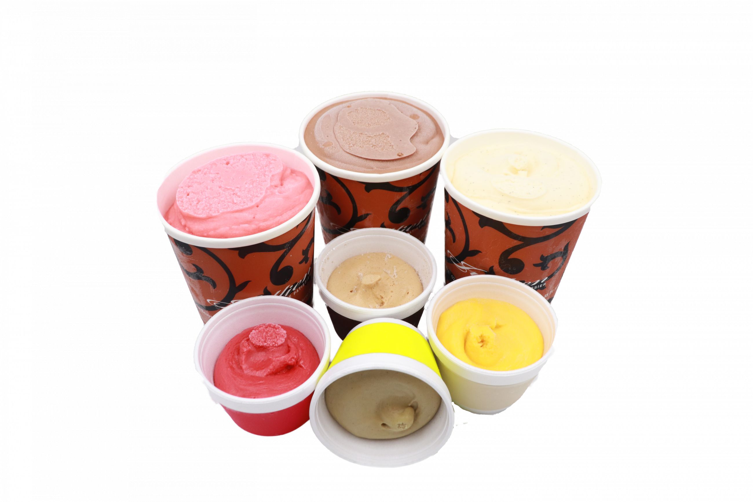 Lait, sucres, crème, oeuf, fruits variés, chocolat, vanille de Tahiti, café, pistache