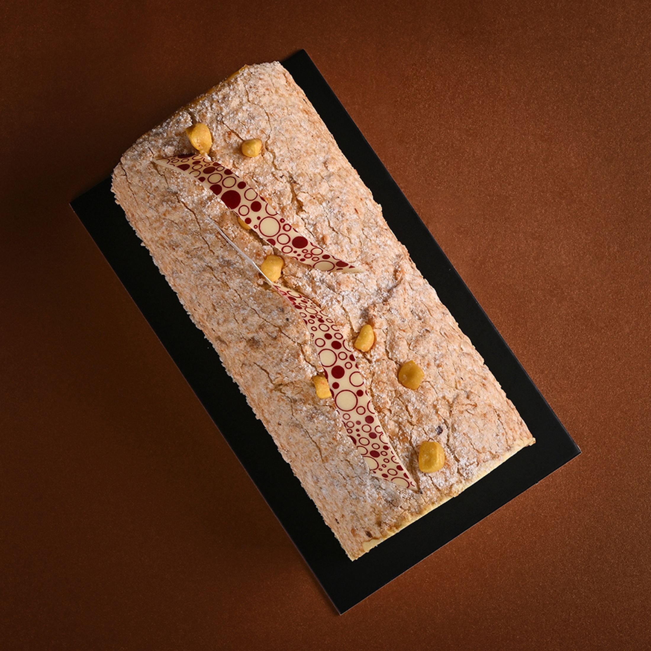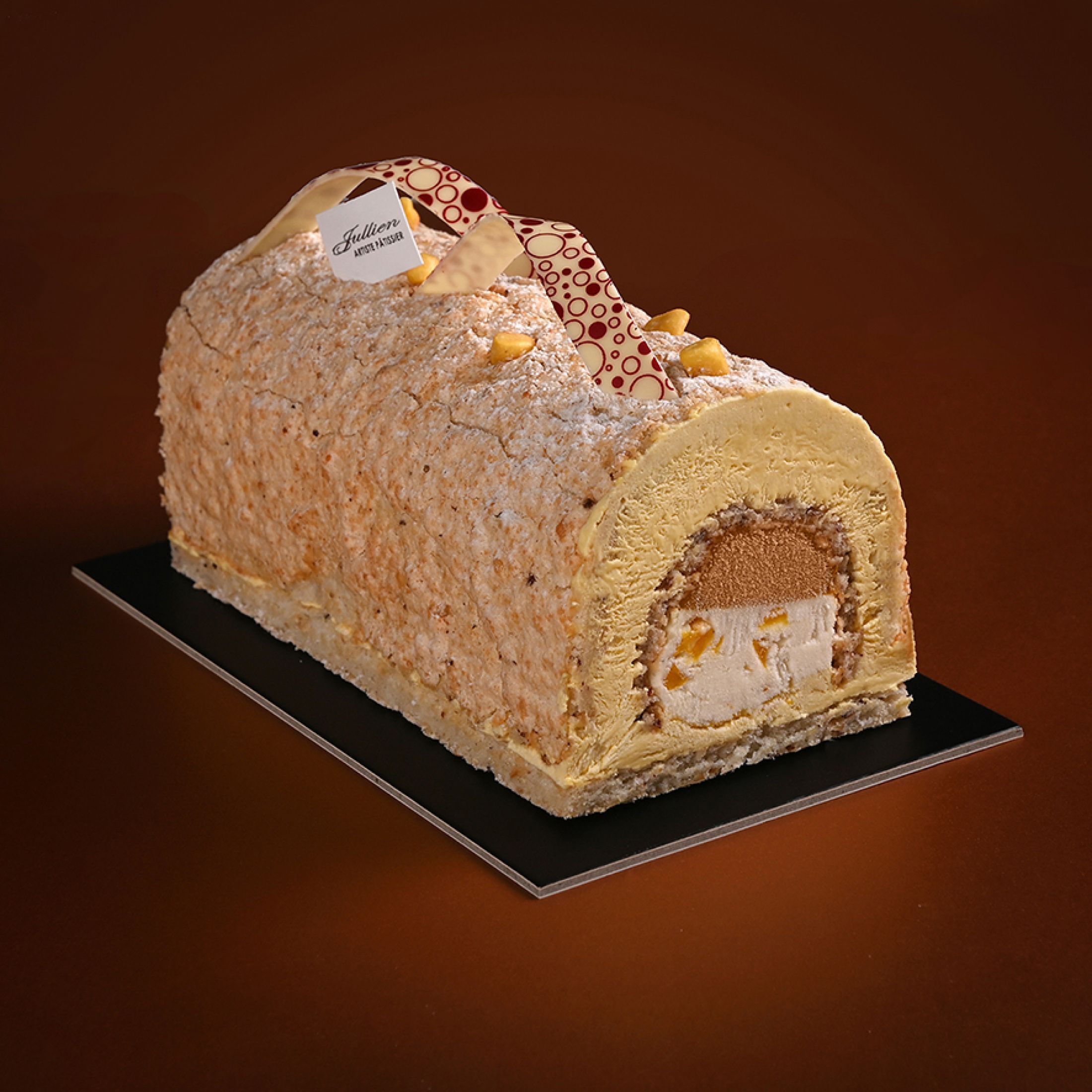 NoëlRetrouvez dans cette bûche les saveurs des tropiques avec un confit de mangue, une mousse aux fruits exotiques et une mascarpone à la vanille de Madagascar, le tout dans une dacquoise aux noisettes du Piémont.