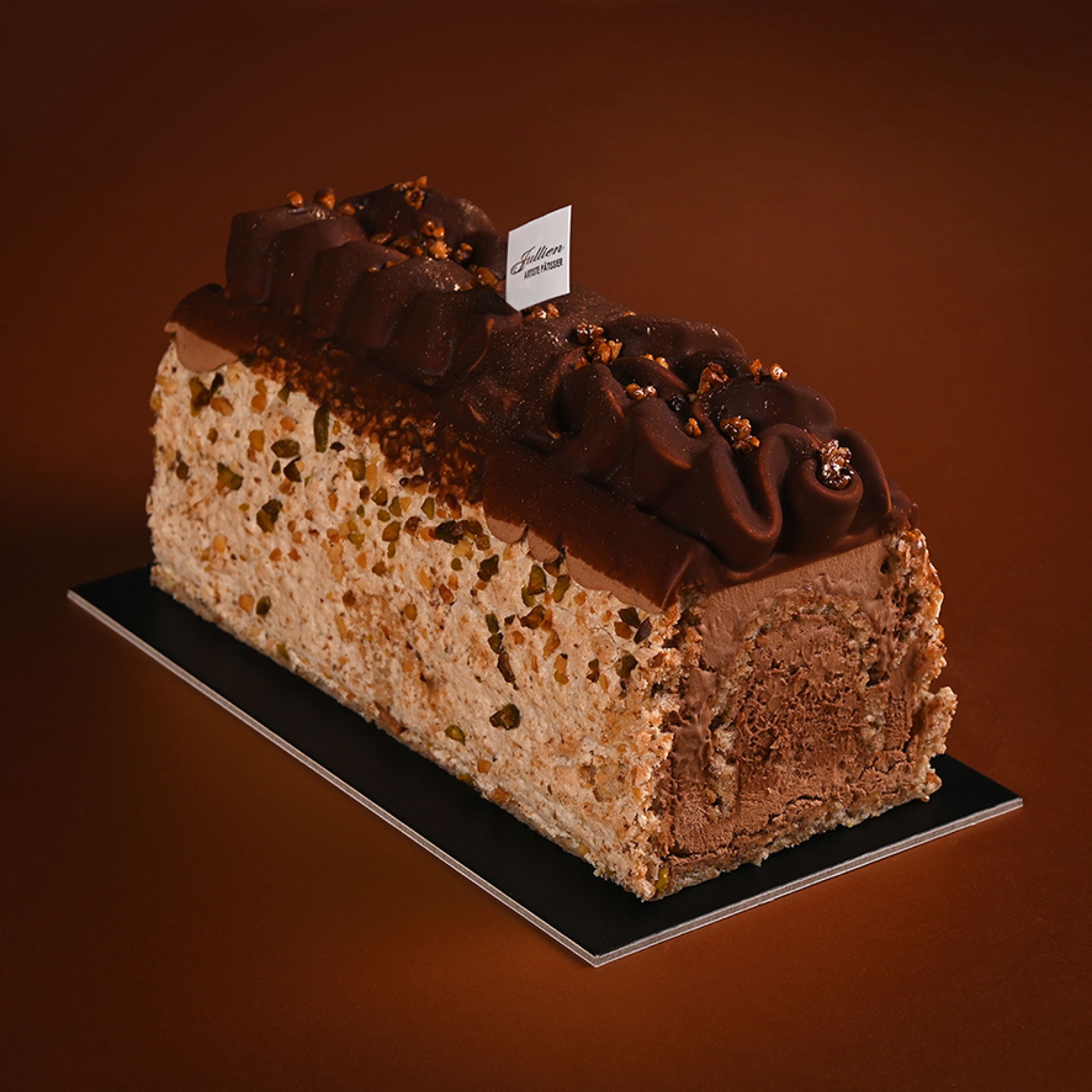 Chocolat noir, crème fraiche, sucre, lait, oeufs, noisette, pistache, amande, fécule de pomme de terre.