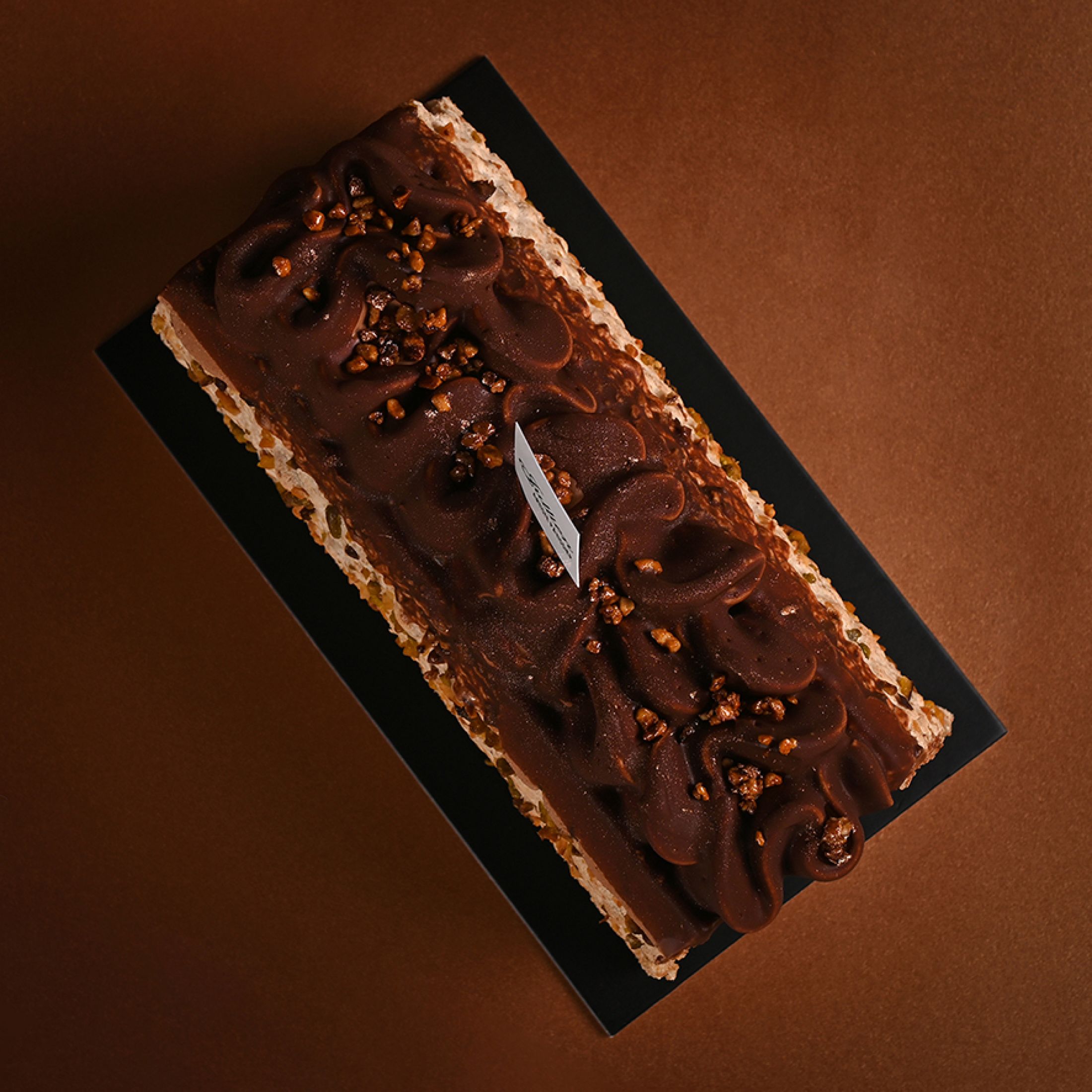 NoëlVous retrouverez dans cette bûche la saveur exceptionnelle d'un chocolat en provenance du Venezuela pur criollo 65% de cacao et d'un biscuit fondant parsemé de fruits secs torréfiés (pistache, amande et noisette).