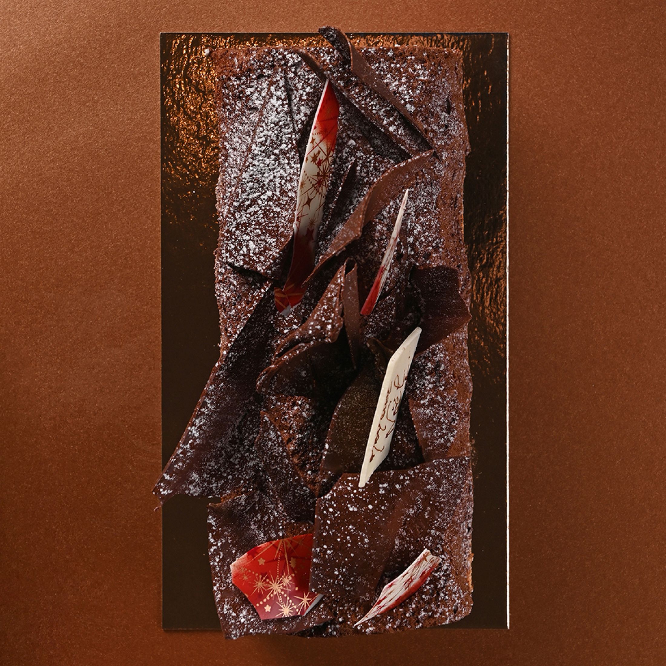 NoëlMeringue enrobée d’une mousse chocolat noir 66% de cacao pur Caraïbe sur un biscuit joconde aux amandes.