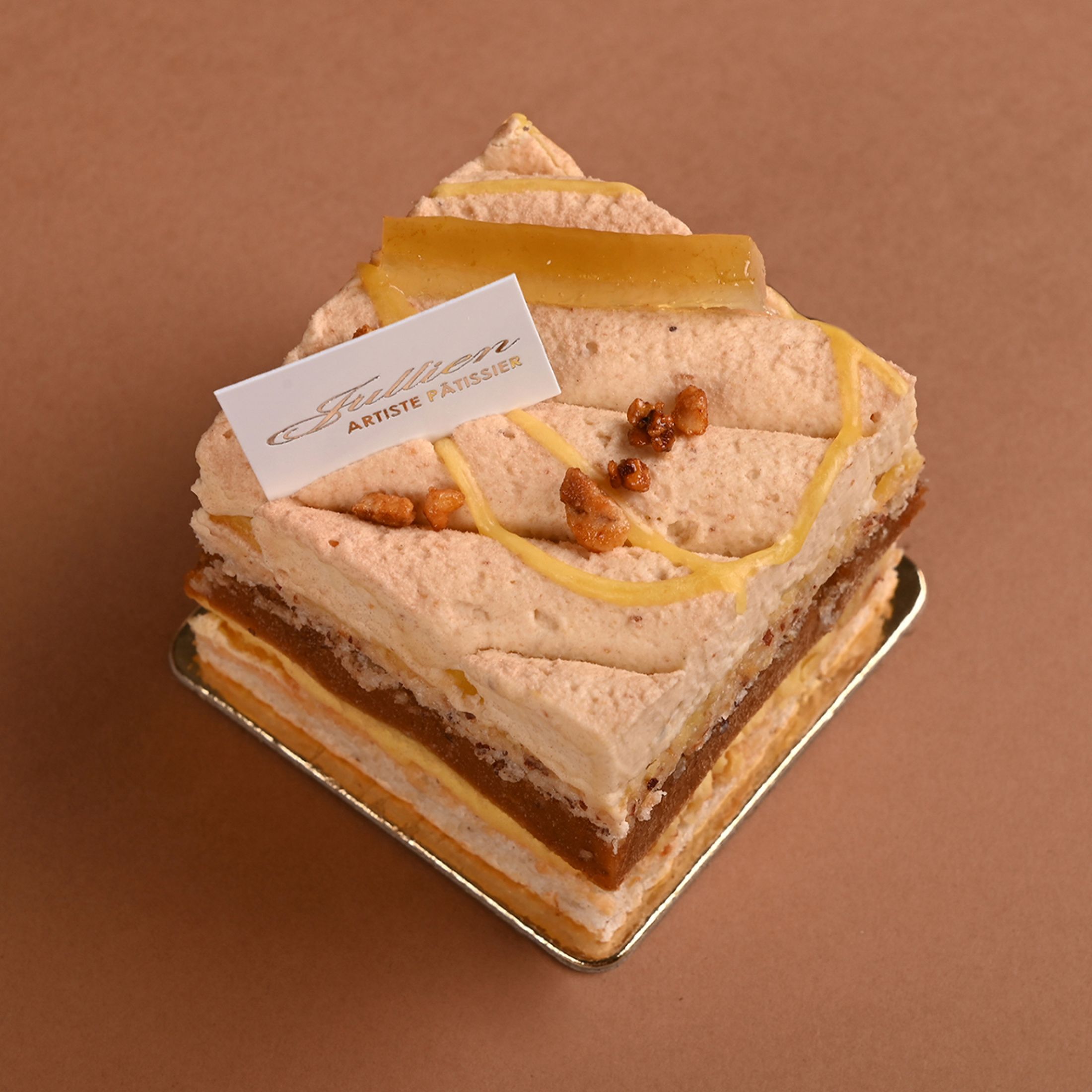 PâtisseriesSavoureux biscuit aux noisettes du Piémont nappé d'une crème citron jaune et d'un crémeux praliné noisettes.