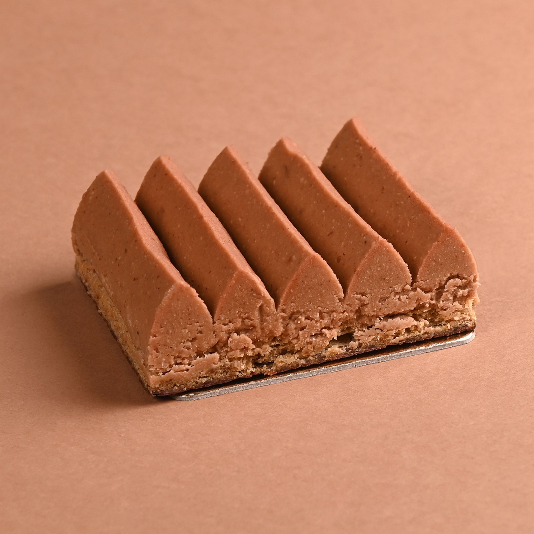 Après cristallisation, le gianduja est dressé sur un biscuit moelleux aux noisettes.