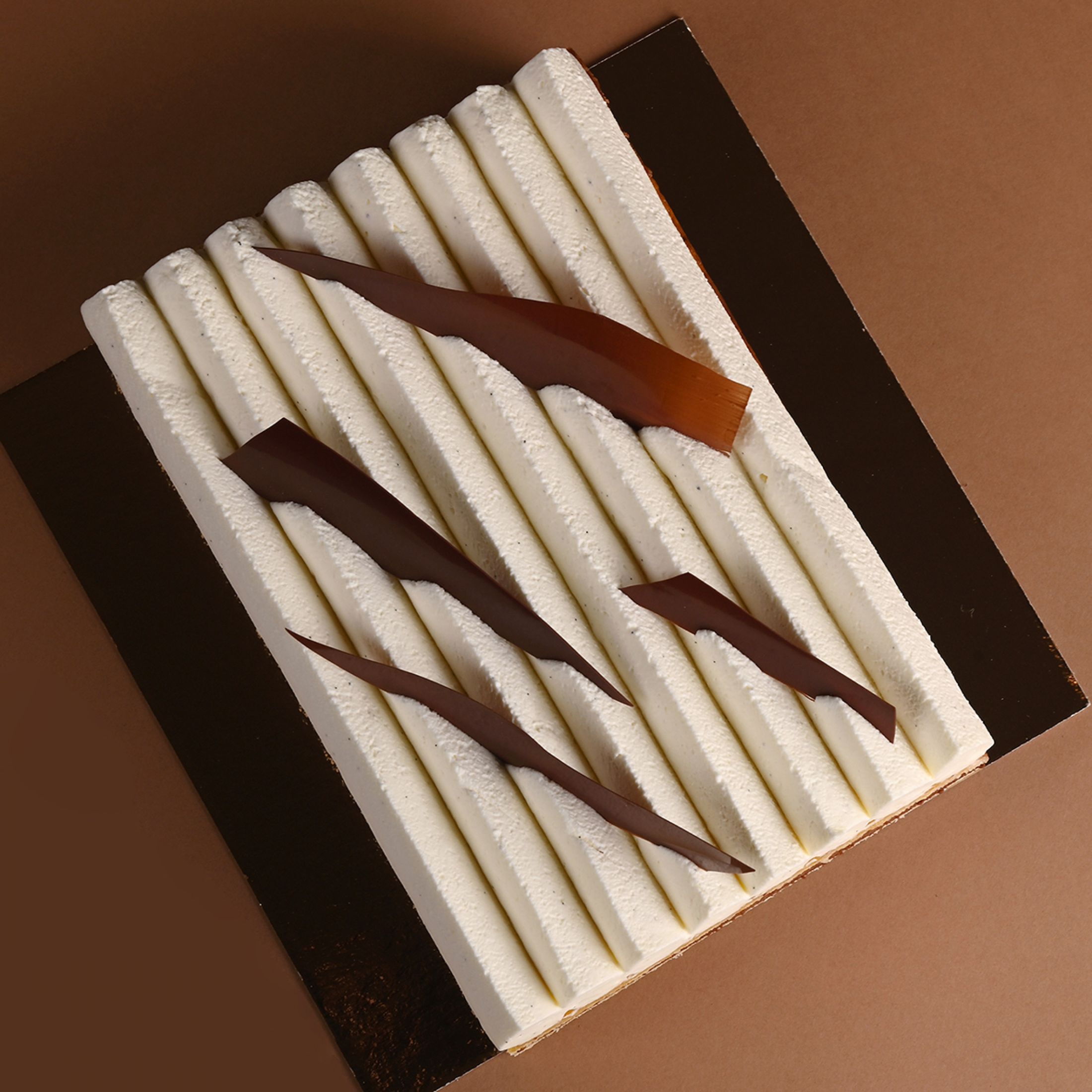 PâtisseriesBiscuit Joconde caramélisé garni d'une crème montée vanille de Tahïti et chocolat noir 70% de cacao.