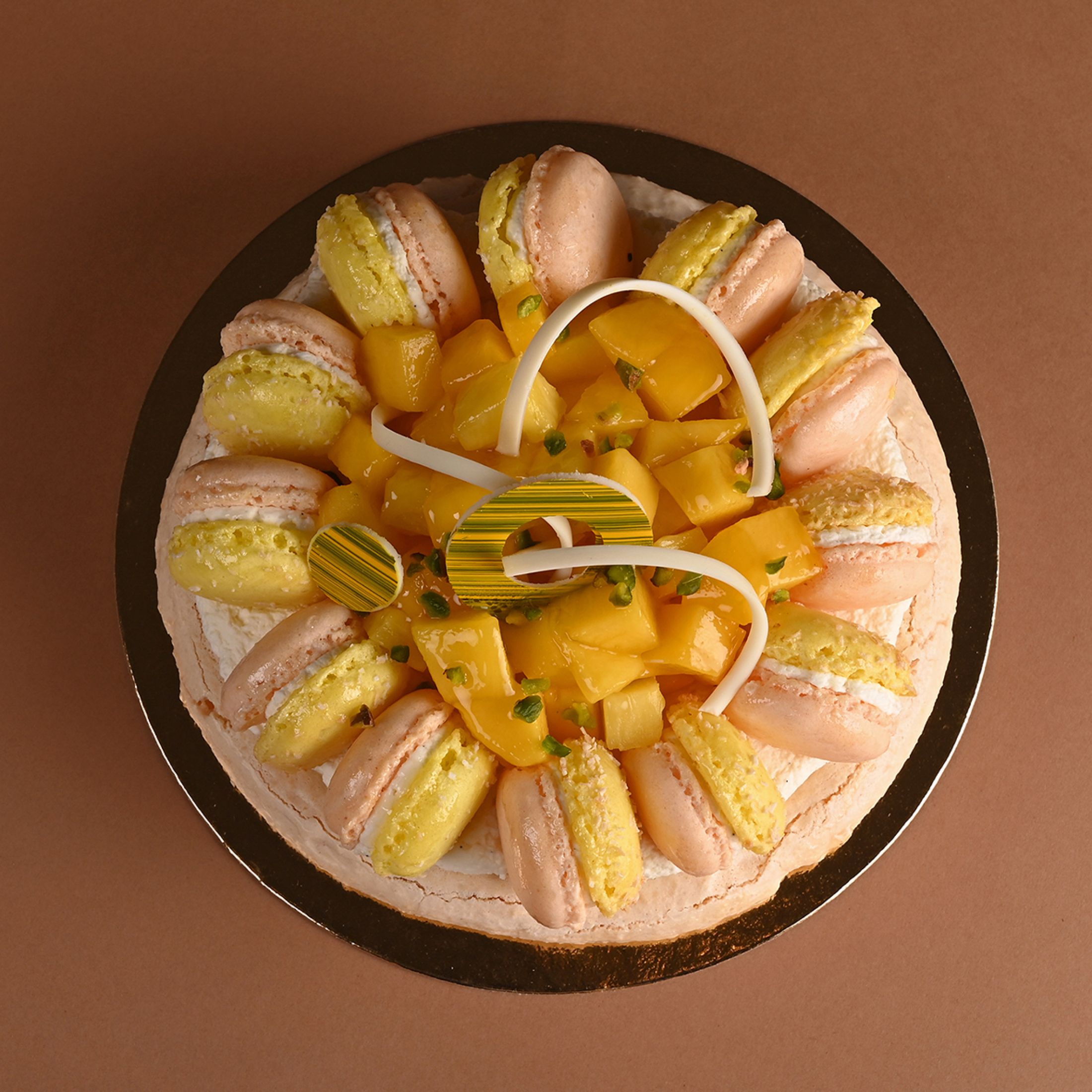 Macarons garnis d'une crème onctueuse infusée à la vanille gousse, au centre desquels sont disposés des mangues et des ananas.
