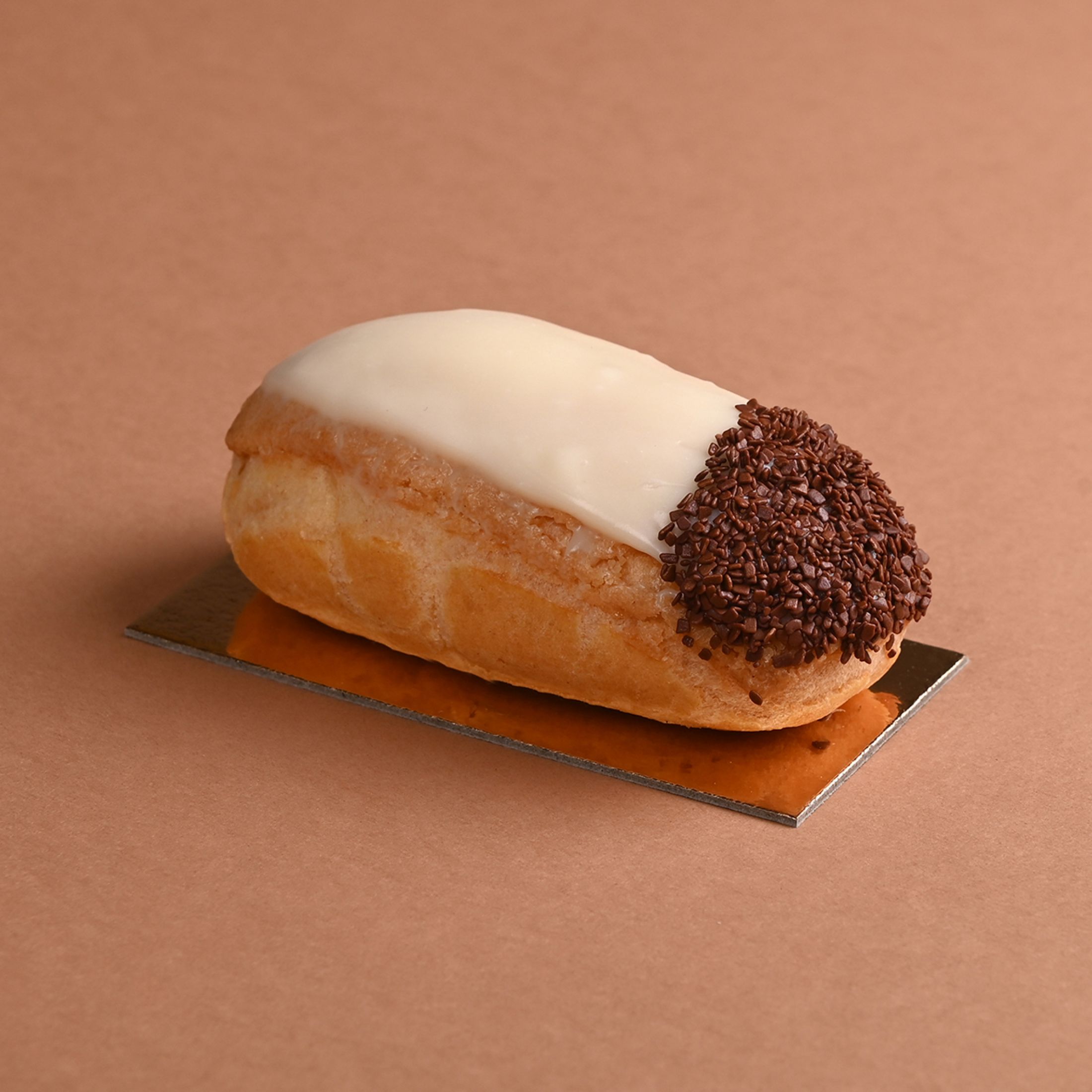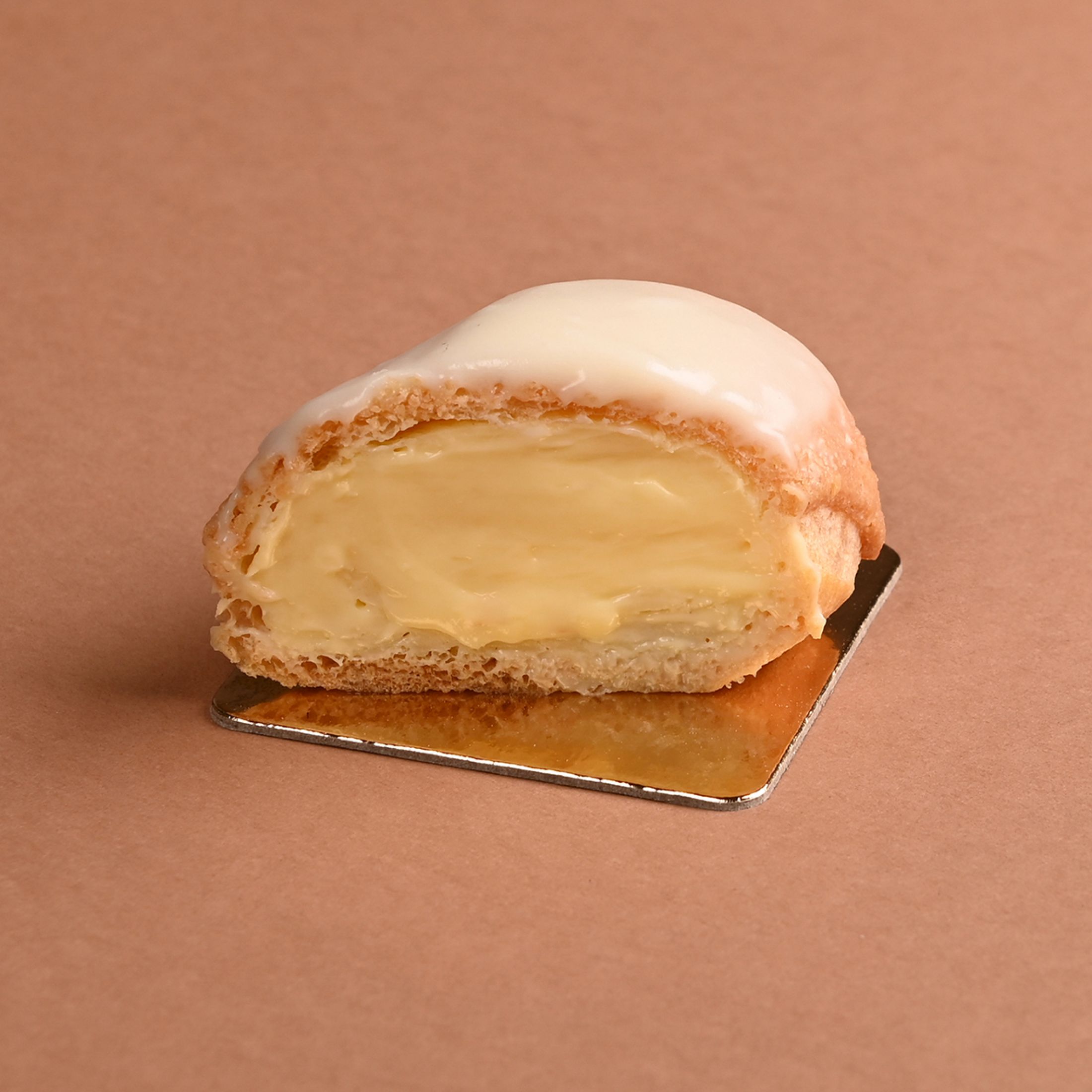 PâtisseriesPâte à choux garnie de crème pâtissière parfumée au kirch nappée d'un glaçage chocolat blanc.