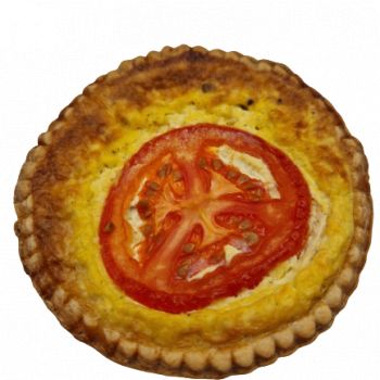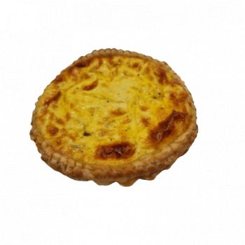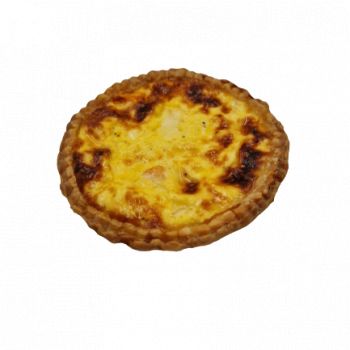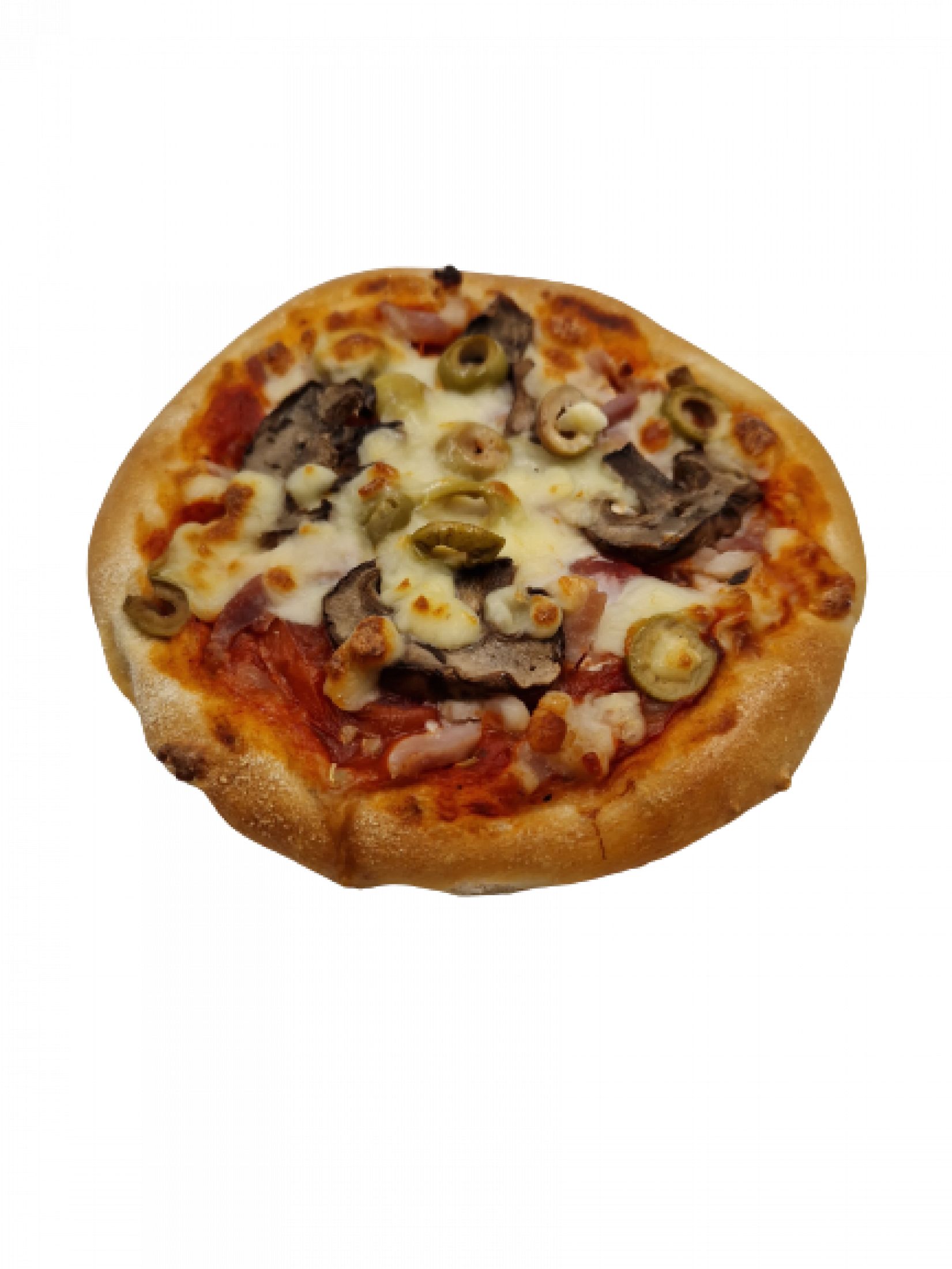Pizza Traiteur Ingrédients : tomate, oignon, lardon, olive, mozzarella, farine de blé, sel, levure, huile d'olive.